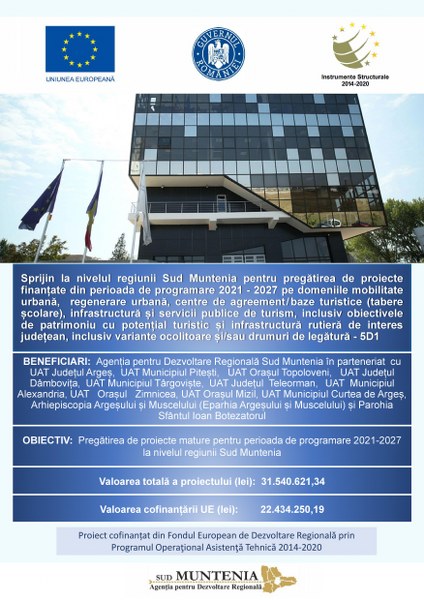 La nivelul regiunii Sud Muntenia se oferă sprijin pentru pregătirea de proiecte finanțate din perioada de programare 2021 - 2027 pe domeniile mobilitate urbană, regenerare urbană, centre de agreement/baze turistice (tabere școlare), infrastructură și servicii publice de turism, inclusiv obiectivele de patrimoniu cu potențial turistic și infrastructură rutieră de interes județean, inclusiv variante ocolitoare și/sau drumuri de legătură - 5D1.