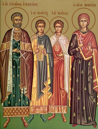 În această lună, în ziua a douăzecea, pomenirea Sfântului Marelui Mucenic Eustatie si Teopista, soţia lui, şi doi fii ai lor: Agapie şi Teopist.