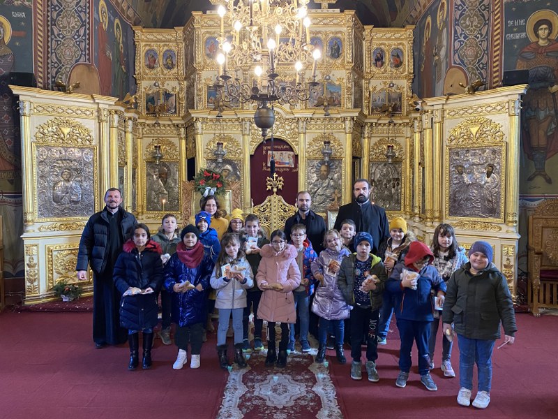Preoții Sturzeanu Dumitru-Victor și Stănescu Paul-Adrian au primit grupul de colindători și le-au împărțit daruri, mulțumindu-le pentru dragostea cu care aceștia au colindat.