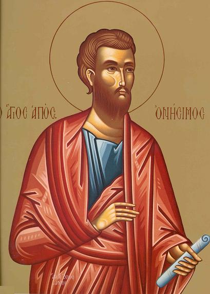 Sfântul Onisim, unul din cei 70 de apostoli, a fost în tinereţea lui sluga lui Filimon, un creştin de neam bun, din orasul Colose, în Frigia. Vinovat de greşeală faţă de stăpânul său şi temându-se de pedeapsă, Sf. Onisim a fugit la Roma, dar cum era rob fugit de la stăpân, a ajuns în temniţă. Acolo l-a întâlnit pe Sf. Apostol Pavel, de la care a luat cuvinte de învăţătură luminându-se şi primind botezul.